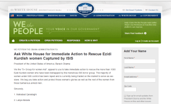 I’m reluctant to what kind of international support Iraq and Syria are needing in the ongoing crisis of ISIS, as I as most other people don’t want to see previous disasters repeated all over again. But tonight my friends the women’s right activists at Warvin Foundation for Women’s Issues in Iraqi Kurdistan e-mailed me about a petition that they have signed for the White House, where they ask them to take immediate action to rescue the kidnapped Yesidi Kurdish women from ISIS, and I had a look.